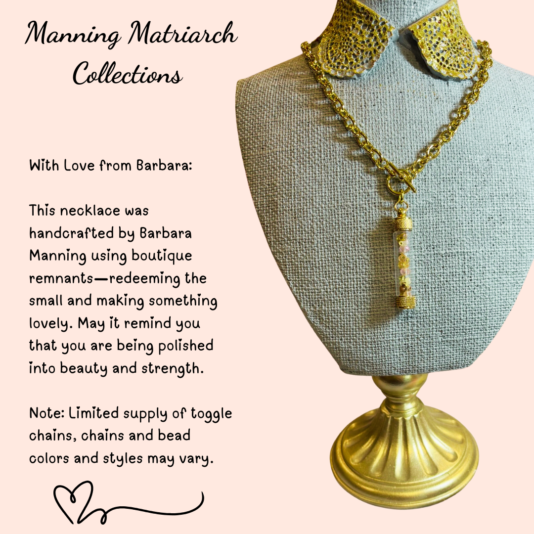 - Handmade Artisan Necklace — Crafted by Barbara Manning from boutique remnants; a one-of-a-kind keepsake symbolizing beauty refined through trials