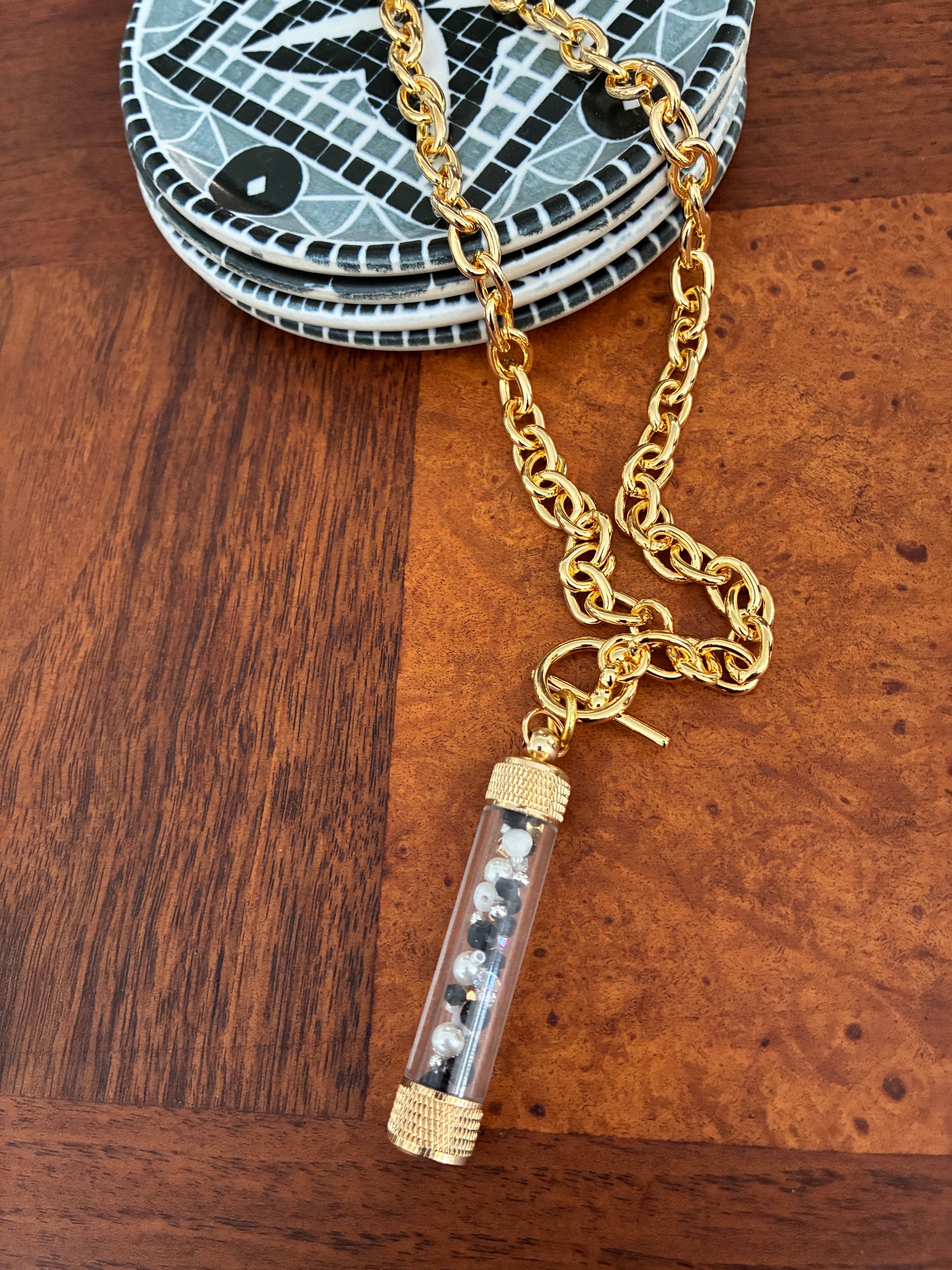 Each Vessel Toggle Necklace is lovingly assembled by hand by Barbara, an artisan whose work reflects patience, care, and intention in every detail. This piece features a substantial 18 inch gold-tone chain with a secure toggle clasp, finished with a clear glass vial filled with carefully chosen beads — a quiet reminder that what we carry, both seen and unseen, matters.
